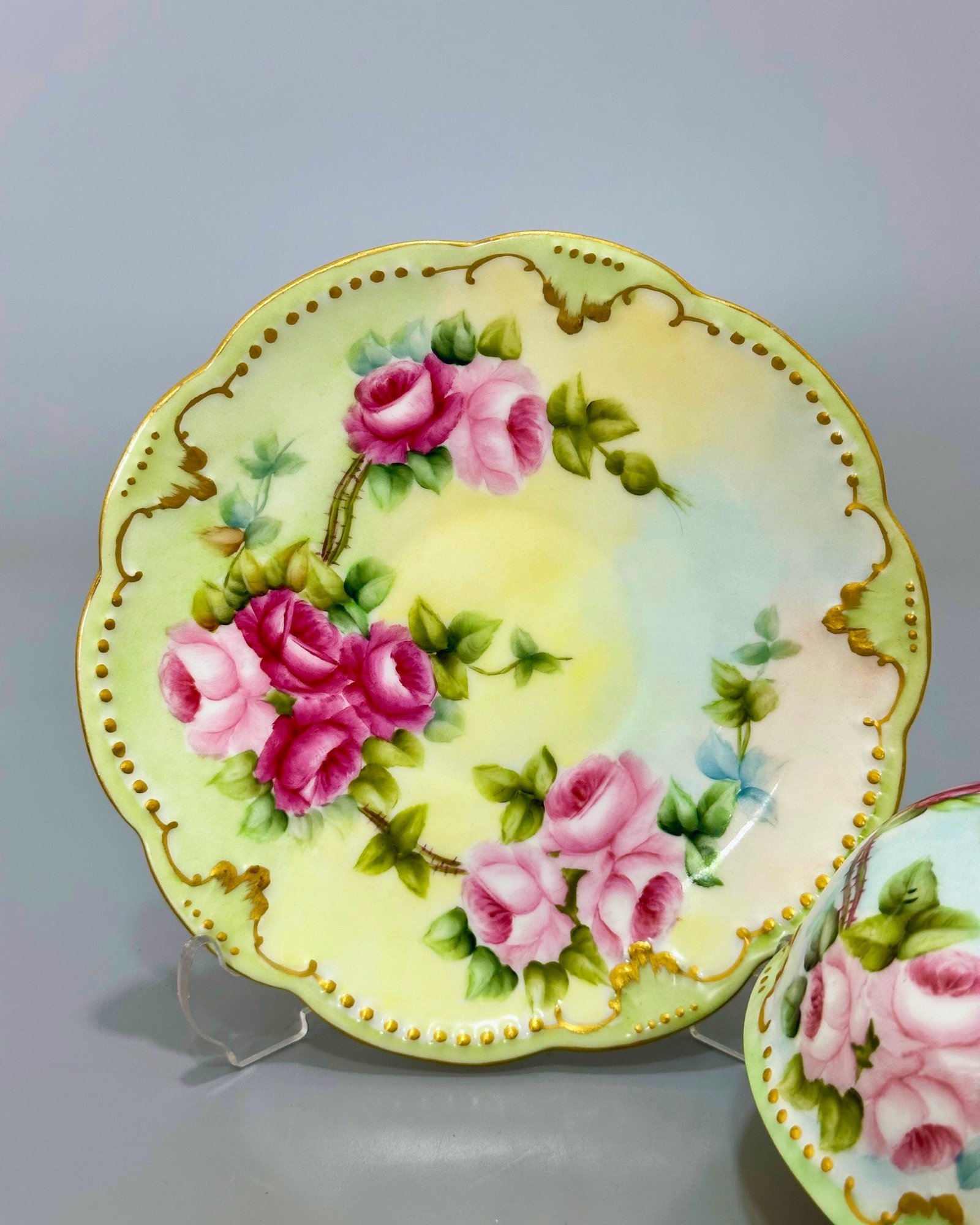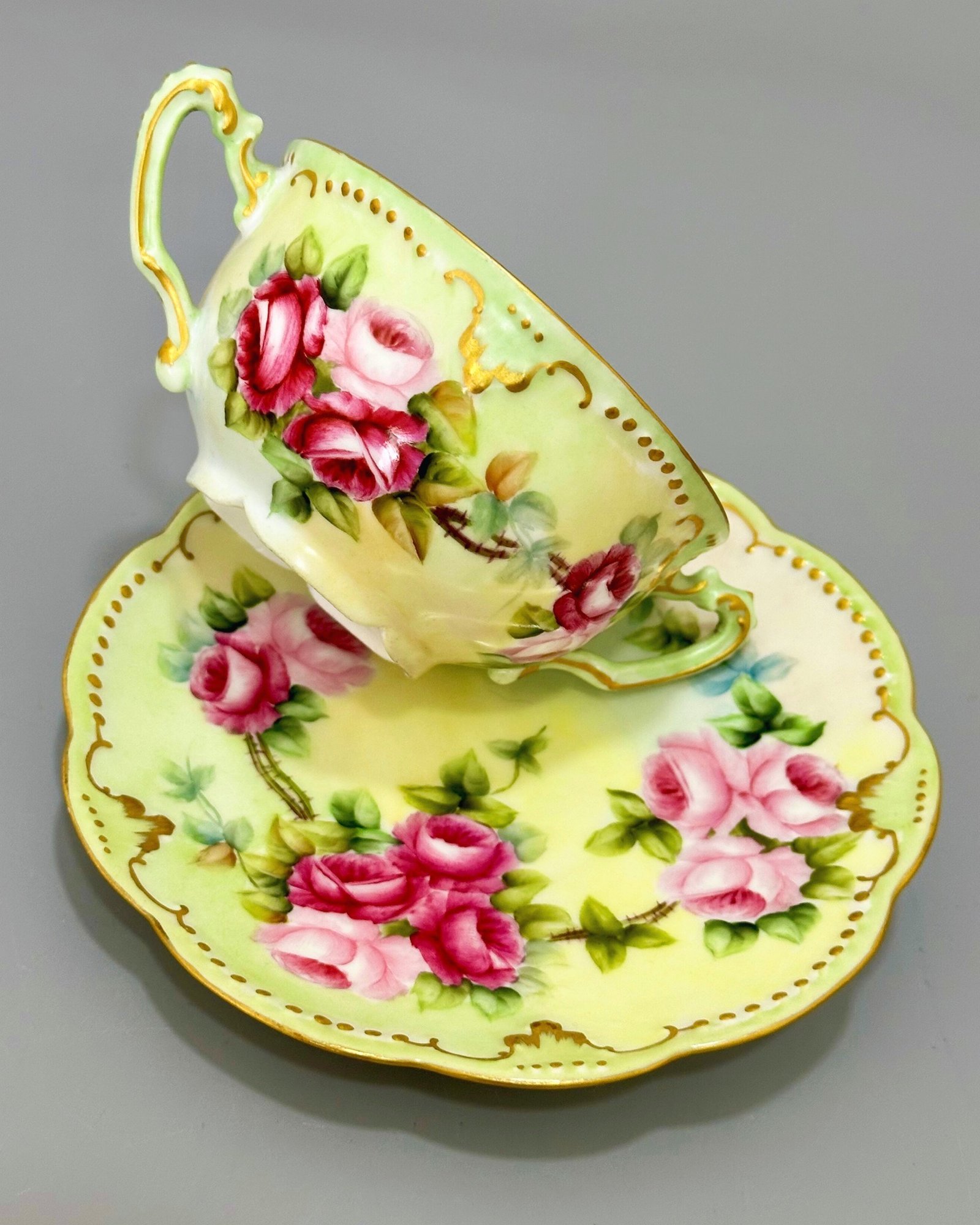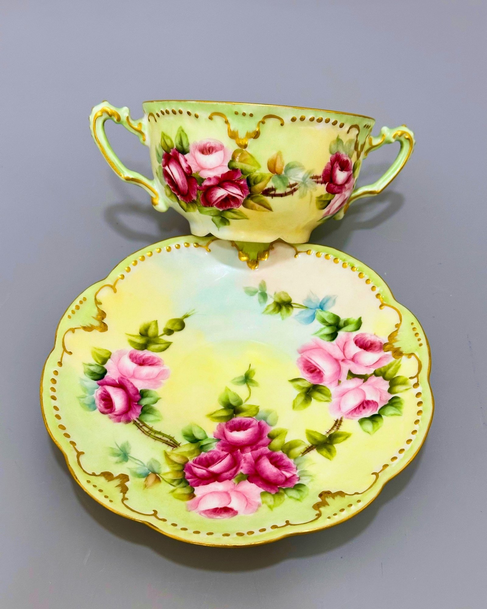 Bu zarif Limoges porselen fincan, gövdesini süsleyen el boyaması pembe ve fuşya güller, yumuşak sarı-yeşil degrade zemin ve ince altın kontur detaylarıyla dönemin zarafetini yansıtıyor. İki kulplu formu, 19. yüzyıl sonu – 20. yüzyıl başı Fransız consommé fincanı geleneğini temsil eder. Altında yer alan A.K.D. (A. Klingenberg & Charles Dwenger) damgası, 1890–1910 yılları arasında Limoges’ta üretilen yüksek kaliteli, koleksiyonluk parçaların imzasıdır. 🌿✨